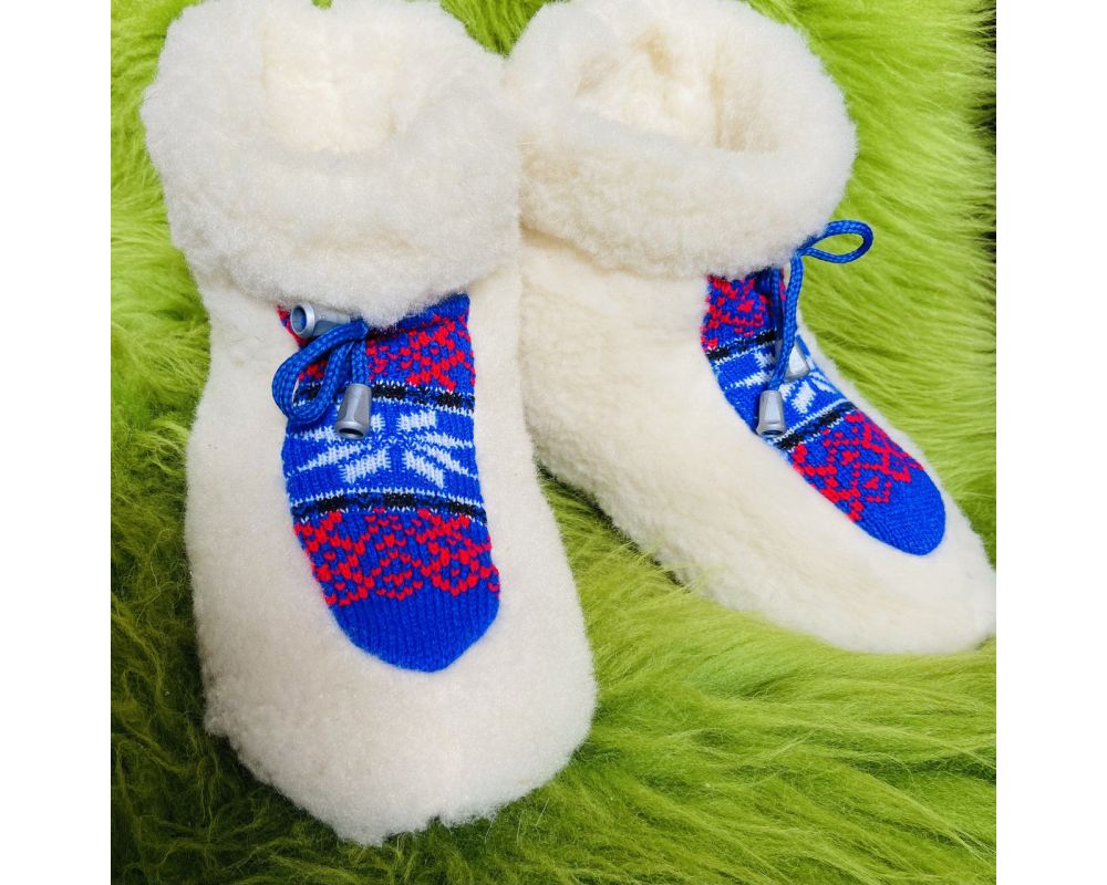 Чуні з овечої шерсті, cніжинка кольорові синій-червоний, гумова підошва