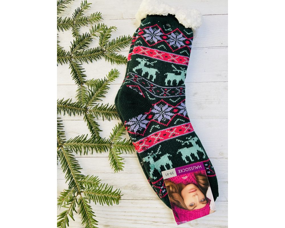 Шкарпетки жіночі з хутра, шкарпетки з овечої шерсті , новорічні носки, носки олені 35-38 39-41 зелені