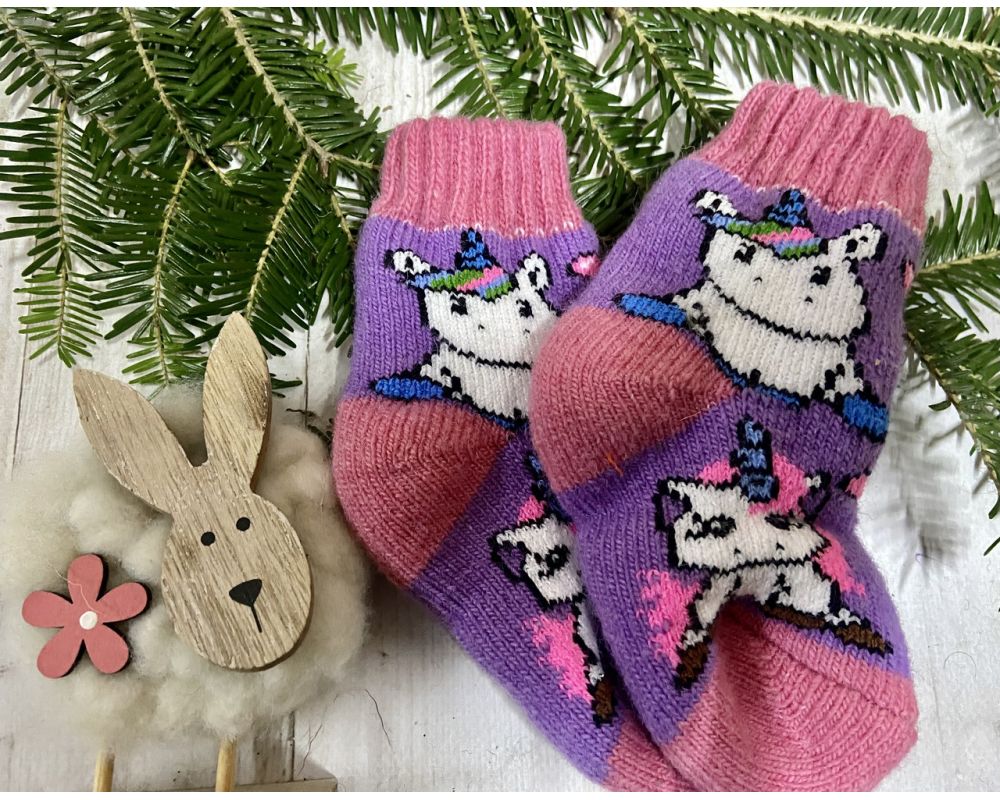 Шкарпетки дитячі, виготовлені з овечої шерсті з додаванням козячого пуху. Теплі та комфортні. В наявності різні забарвлення і малюнки.