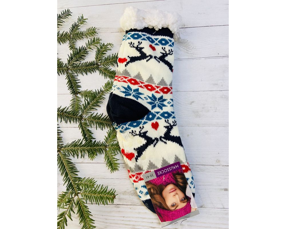 Теплі жіночі шкарпетки в асортименті. Низ носка виготовлений з гумовими пухирцями, що робить хороше зчеплення носка з підлогою. Склад 65% шерсть, 25% поліамід, 10% поліакрил..