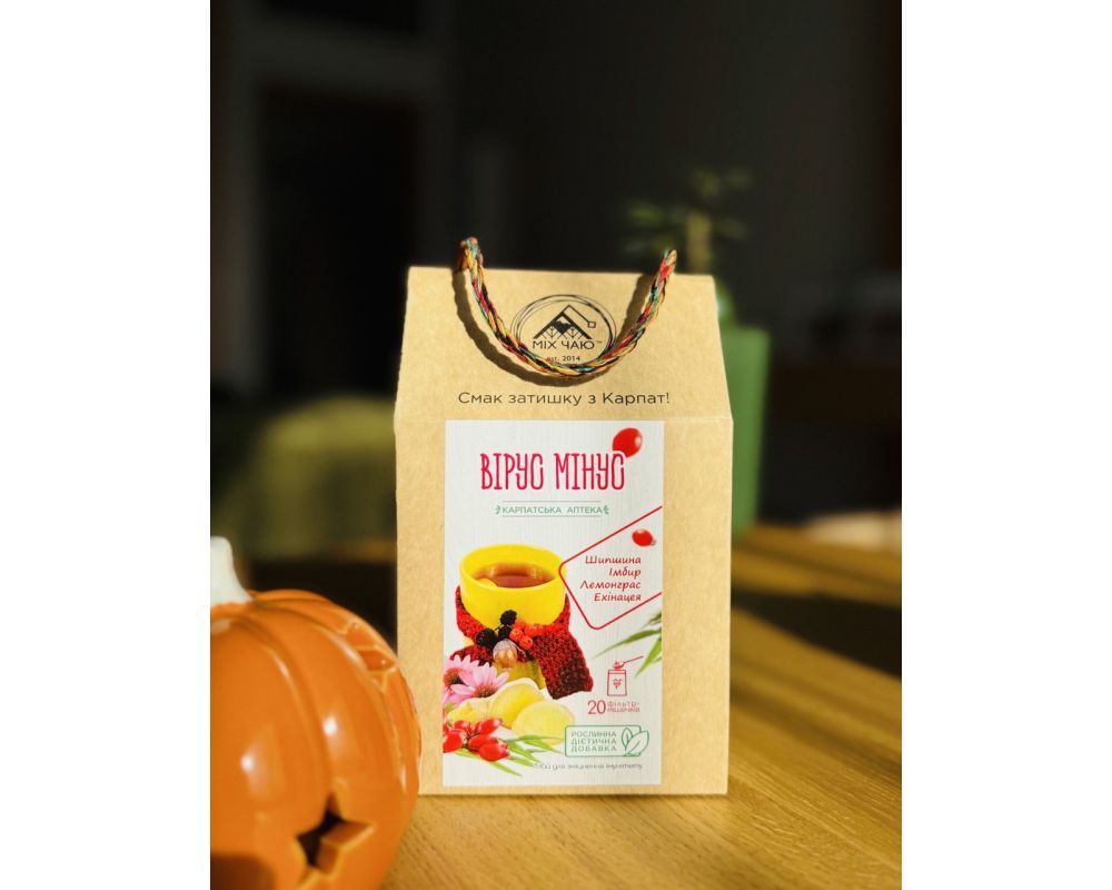 20 фільтр пакетиків Склад: шипшина, імбир, лемонграс, ехінацея В холодний період року дуже треба дбати про імунітет. Саме він є щитом нашого організму від вірусів та застуд. Ми поєднали супер вітамінні та корисні трави і ягоди для підтримки міцності вашого імунітету. «Вірус мінус» чай, що підтримує організм в період сезонних захворювань, допомагає швидше впоратись із ознаками ГРВІ, зігріває, наповнює вітамінами. За більш детальною інформацією щодо товарів та замовлень звертайтесь Telegram Viber +380637305731 https://suvenirykarpat.com.ua/ua/