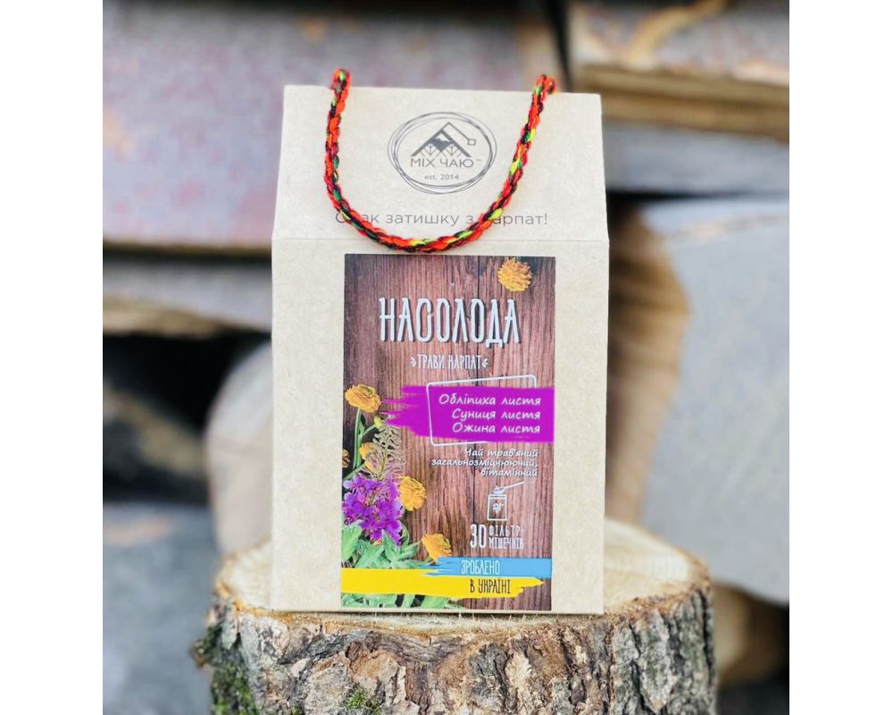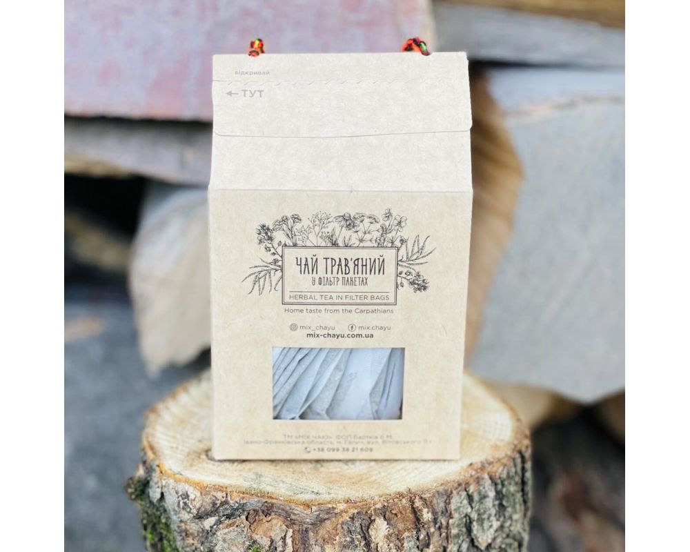 Суміш трав’яного Карпатського чаю у фільтр пакетиках, яка складається з: листя обліпихи, листя ожини та листя суниці.