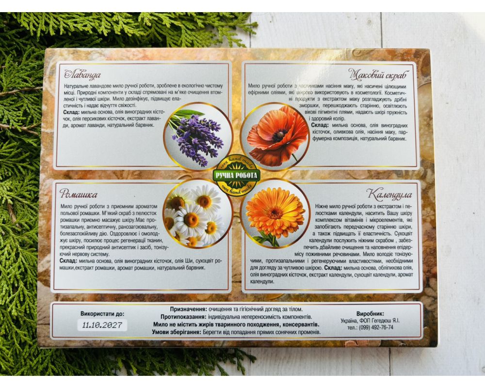 Подарунковий набір, натуральне мило ручної роботи, зроблене в екологічному місці.. В наборі 4 мила по 60 г.
