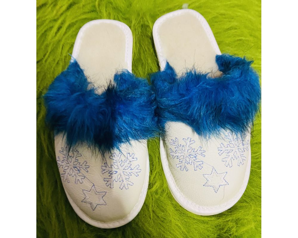 • Домашні жіночі шкіряні капці з овечої шерсті, Сніжинка синє хутро