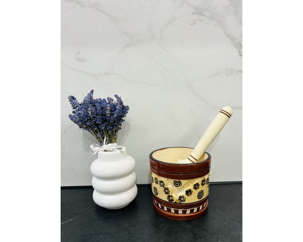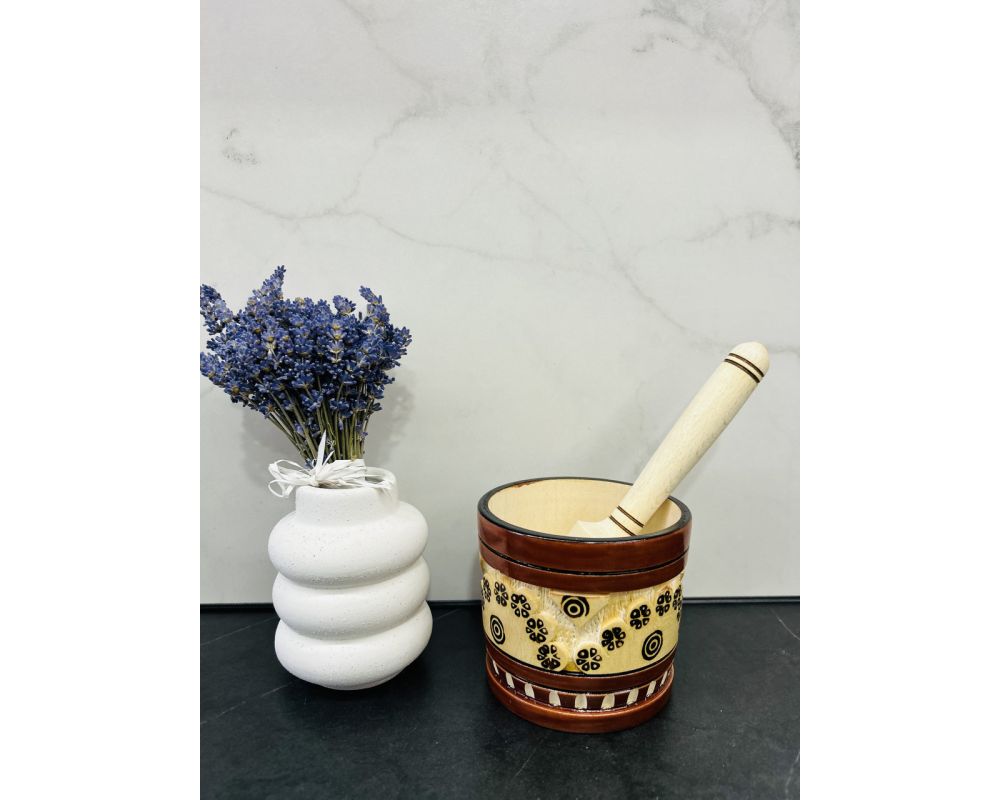 Дерев'яна ступка з товкачем. Виготовлена із натурального дерева (бук). Ручна робота. Висота 9 см, діаметр 9 см. Товкач 16 см.