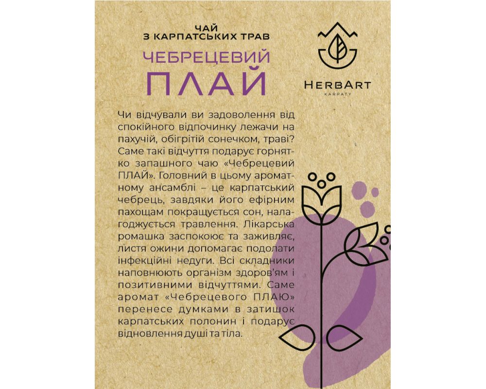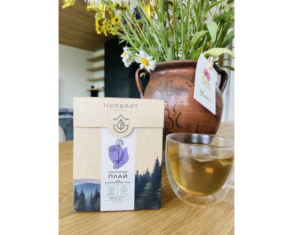 Чай «Чебрецевий ПЛАЙ» це поєднання запашного чебрецю, лимонної материнки та ніжної ромашки. Чаювання точно стане супер запашним та смачним, з приємними спогадами з Карпатського плаю!