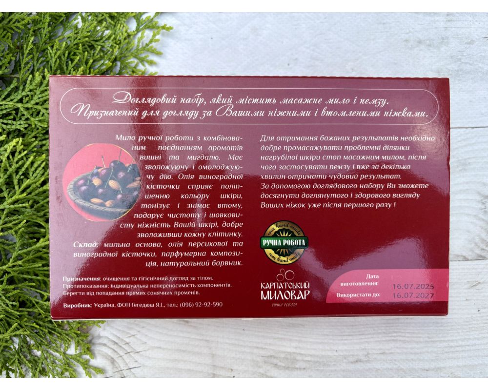 Доглядовий набір, який містить масажне мило і пемзу. Призначений для догляду за Вашими ніжчими і втомленими піжками.Мило ручної роботи з комбінованим поєднанням ароматів вишні та мигдалю. Має зволожуючу і омолоджую-чу дію. Олія виноградної кісточки сприяє поліпшенню кольору шкіри, тонізує і знімає втому, подарує чистоту і шовковисту ніжність Вашій шкірі, добре зволоживши кожну клітинку. Склад: мильна основа, олія персикової та виноградної кісточки, парфумерна компози- ція, натуральний барвник. Призначення: очищення та гігієнічний догляд за тілом. Протипоказання: індивідуальна непереносимість компонентів. Берегти від попадання прямих сонячних променів. Для отримання бажаних результатів необхідно добре промасажувати проблемні ділянки нагрубілої шкіри стоп масажним милом, після чого застосувати пемзу і вже за декілька хвилин отримати чудовий результат. За допомогою доглядового набору Ви зможете досягнути доглянутого і здорового вигляду Ваших ніжок уже після першого разу !