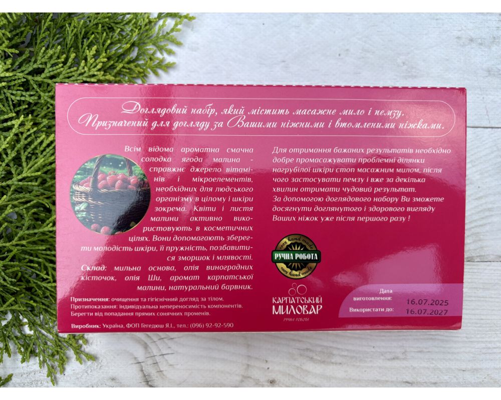 Доглядовий набір, який містить масажне мило і пемзу.Всім відома ароматна смачна солодка ягода малина - справжнє джерело вітамінів і мікроелементів, необхідних для людського організму в цілому і шкіри зокрема. Квіти і листя малини активно вико-ристовують в косметичних цілях. Вони допомагають зберегти молодість шкіри, її пружність, позбавитися зморшок і млявості. Склад: мильна основа, олія виноградних кісточок, олія Ши, аромат карпатської малини, натуральний барвник. Призначення: очищення та гігієнічний догляд за тілом. Протипоказання: індивідуальна непереносимість компонентів. Берегти від попадання прямих сонячних променів. Для отримання бажаних результатів необхідно добре промасажувати проблемні ділянки нагрубілої шкіри стоп масажним милом, після чого застосувати пемзу і вже за декілька хвилин отримати чудовий результат. За допомогою доглядового набору Ви зможете досягнути доглянутого і здорового вигляду Ваших ніжок уже після першого разу ! РУЧНА РОБОТА Призначення: очищення та гігієнічний догляд за тілом. Протипоказання: індивідуальна непереносимість компонентів. Берегти від попадання прямих сонячних променів