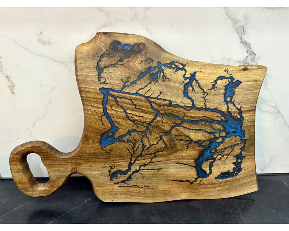 Стильна та функціональна дерев’яна дошка для нарізання та подачі страв, виготовлена вручну з натурального дерева з унікальним малюнком, залитим епоксидною смолою яскравого блакитного кольору. Кожна дошка має неповторний дизайн у техніці Lichtenberg – візерунки, що нагадують розгалуження річок або блискавку, роблять її справжнім витвором мистецтва.
