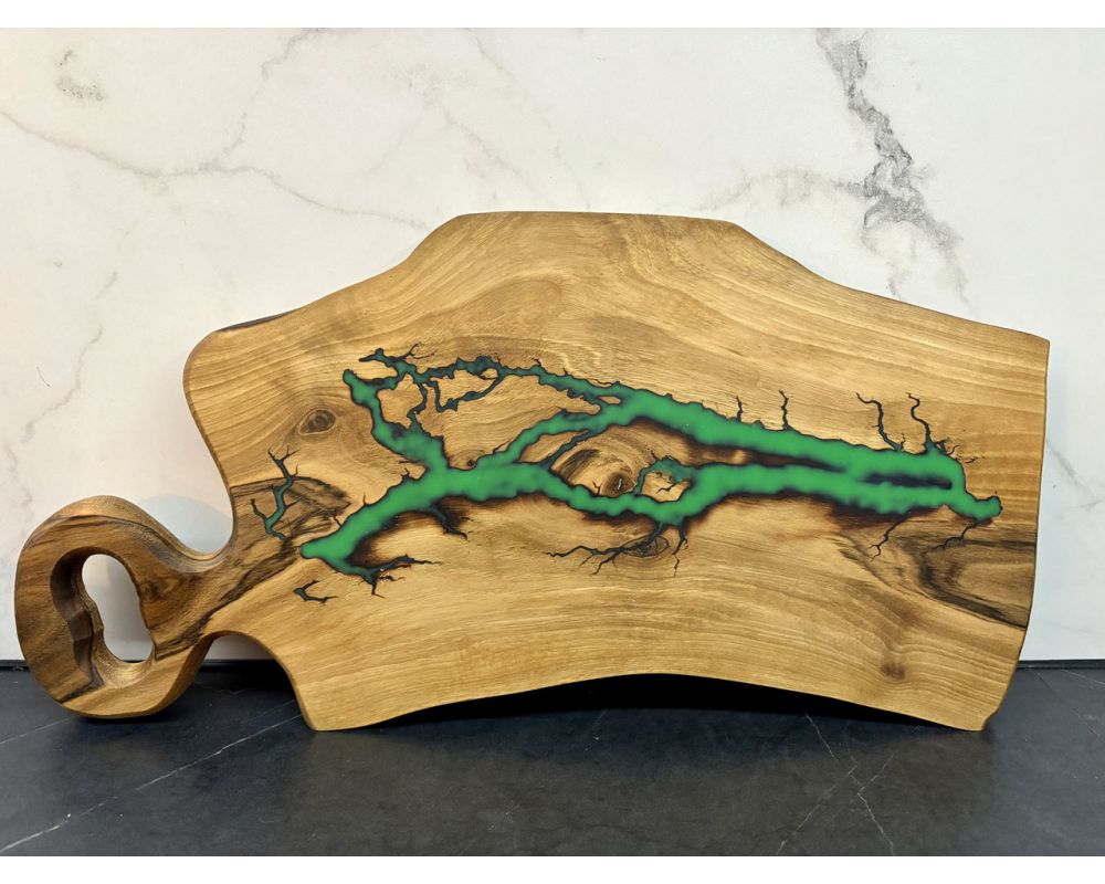 Стильна та функціональна дерев’яна дошка для нарізання та подачі страв, виготовлена вручну з натурального дерева з унікальним малюнком, залитим епоксидною смолою яскравого зеленого кольору. Кожна дошка має неповторний дизайн у техніці Lichtenberg – візерунки, що нагадують розгалуження річок або блискавку, роблять її справжнім витвором мистецтва.