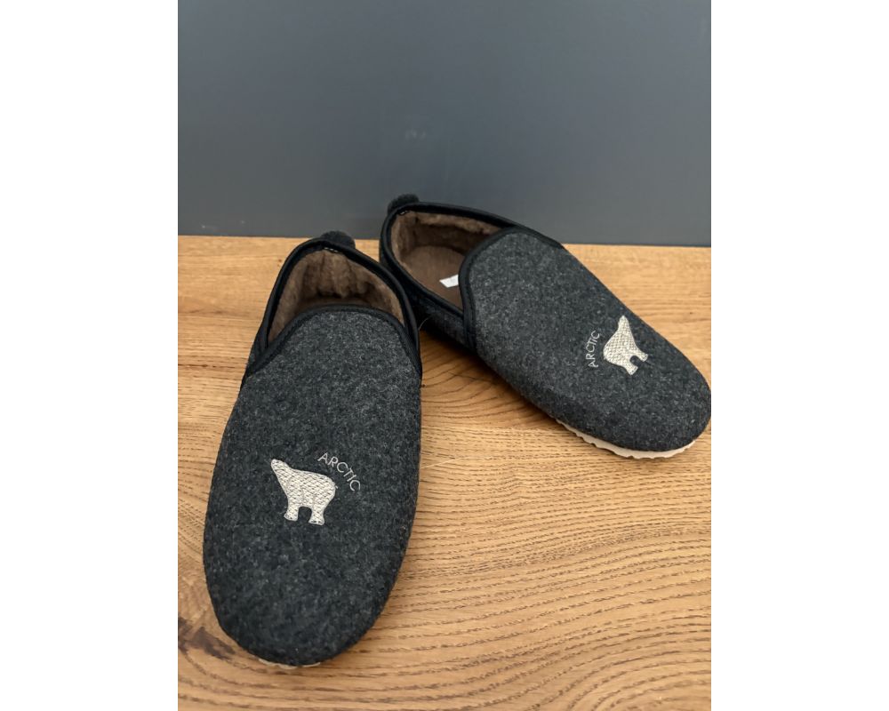 Верх виготовлений із щільного повстяного матеріалу темно-сірого кольору, прикрашений акуратною машинною вишивкою у традиційному орнаменті. Модель має зручну форму, м’яку підошву та легку вагу, тому підходить для щоденного використання вдома.