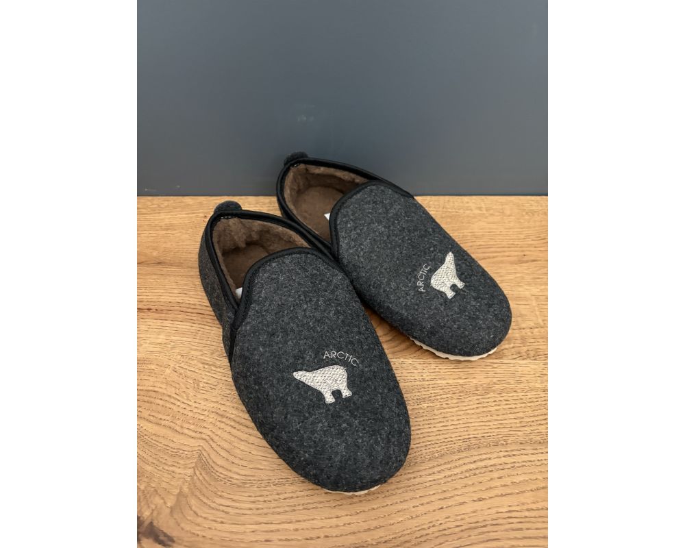 Верх виготовлений із щільного повстяного матеріалу темно-сірого кольору, прикрашений акуратною машинною вишивкою у традиційному орнаменті. Модель має зручну форму, м’яку підошву та легку вагу, тому підходить для щоденного використання вдома.