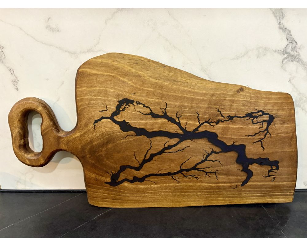 Стильна та функціональна дерев’яна дошка для нарізання та подачі страв, виготовлена вручну з натурального дерева з унікальним малюнком, залитим епоксидною смолою яскравого блакитного кольору. Кожна дошка має неповторний дизайн у техніці Lichtenberg – візерунки, що нагадують розгалуження річок або блискавку, роблять її справжнім витвором мистецтва.