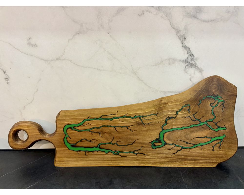 Стильна та функціональна дерев’яна дошка для нарізання та подачі страв, виготовлена вручну з натурального дерева з унікальним малюнком, залитим епоксидною смолою яскравого зеленого кольору. Кожна дошка має неповторний дизайн у техніці Lichtenberg – візерунки, що нагадують розгалуження річок або блискавку, роблять її справжнім витвором мистецтва.