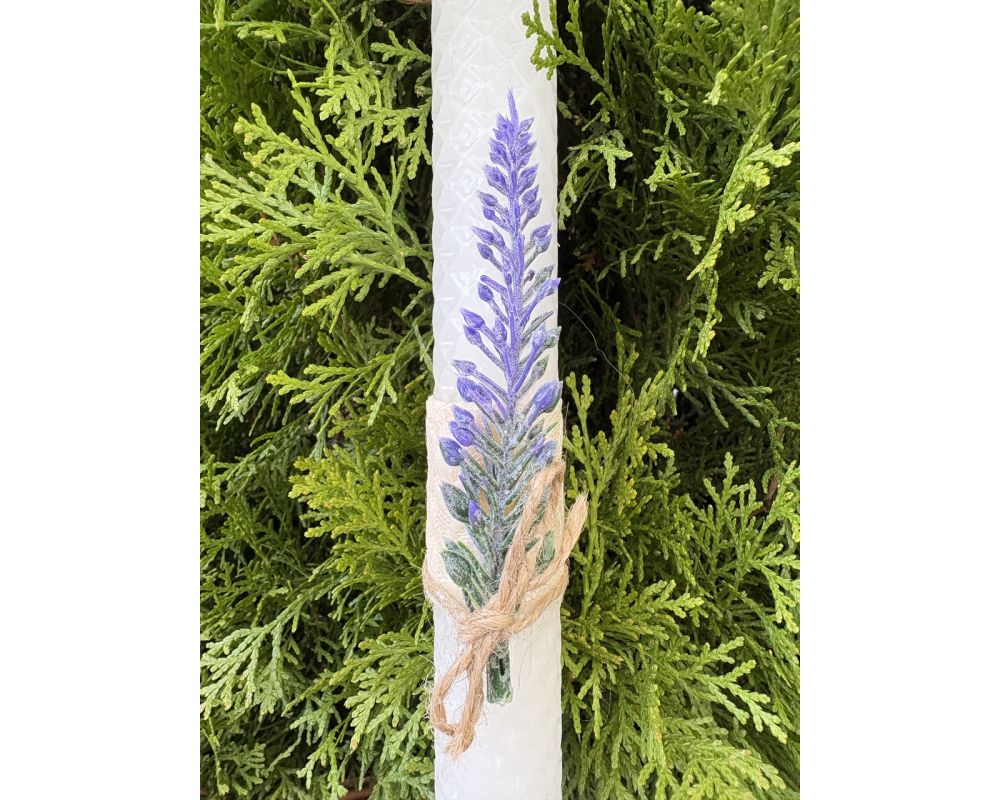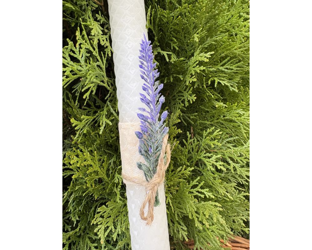 Свічка має фактурну поверхню, що додає їй особливого шарму, а декоративна гілочка лаванди з натуральною стрічкою підкреслює її ніжність та природну естетику. Вона гармонійно доповнить святковий кошик, церемонію в храмі, фотозону або стане частиною подарункового набору.