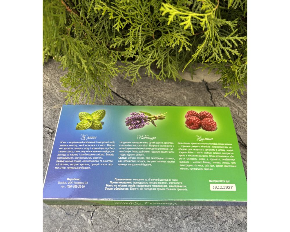 Подарунковий набір, натуральне мило ручної роботи, зроблене в екологічному місці. В наборі 3 мила: М’ята Лаванда Малина по 40 г. Призначення: очищення та гігієнічний догляд за тілом. Протипоказання: індивідуальна непереносимість компонентів. Мило не містить жирів тваринного походження, консервантів. Умови зберігання: Берегти від попадання прямих сонячних променів. За більш детальною інформацією щодо товарів звертайтесь Telegram Viber +380637305731 https://suvenirykarpat.com.ua/ua/