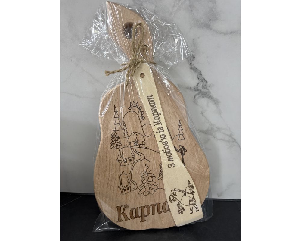 Подарунковий набір, виготовлений з карпатського бука. В набір входить обробна дошка, лопатка і ложка. Прекрасний подарунок для рідних і близьких. Розміри 36х18 см