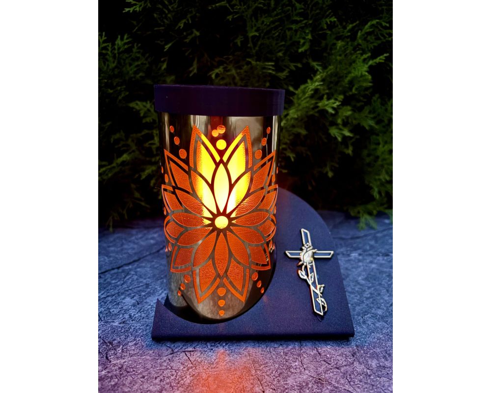 Сучасна лампадка на сонячній батареї у циліндричному корпусі — це поєднання глибокої символіки, довговічних матеріалів та автономних технологій. Модель виготовлена з якісного металу з декоративним покриттям (чорний або золото), що надає виробу стриманого, благородного вигляду.