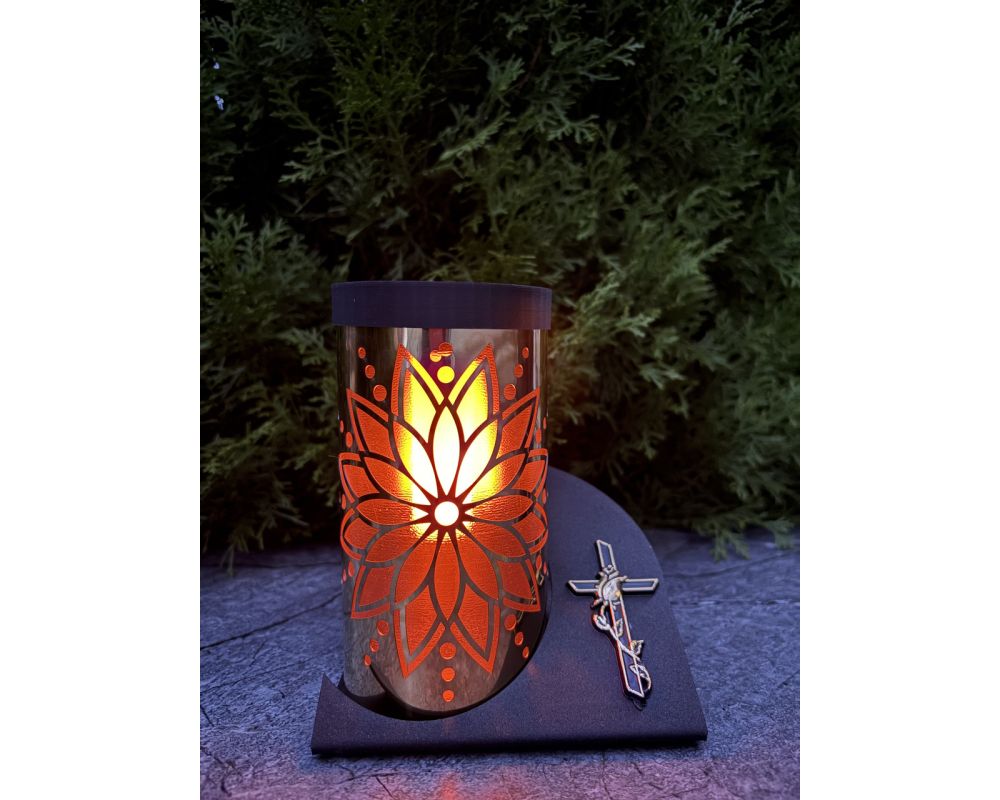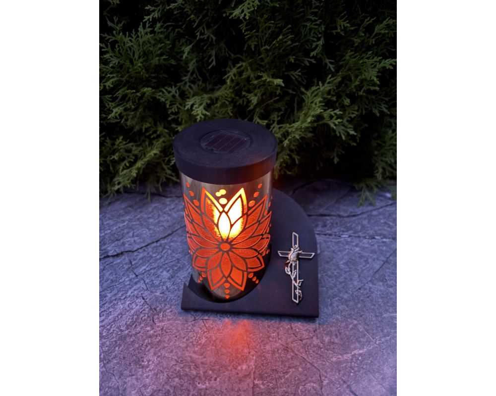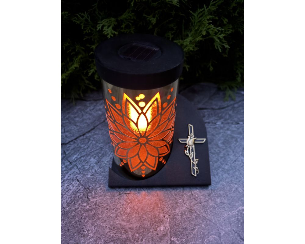 Декоративний хрест з ажурними елементами пропускає світло LED-лампи, створюючи м’яке, рівне свічення у темну пору доби. Вбудована сонячна панель заряджається вдень та автоматично вмикає лампадку вночі, забезпечуючи світло без заміни батарей чи свічок.