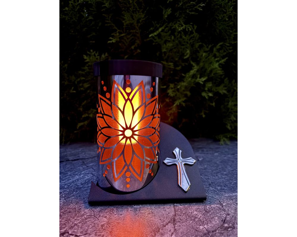 Декоративний хрест з ажурними елементами пропускає світло LED-лампи, створюючи м’яке, рівне свічення у темну пору доби. Вбудована сонячна панель заряджається вдень та автоматично вмикає лампадку вночі, забезпечуючи світло без заміни батарей чи свічок.
