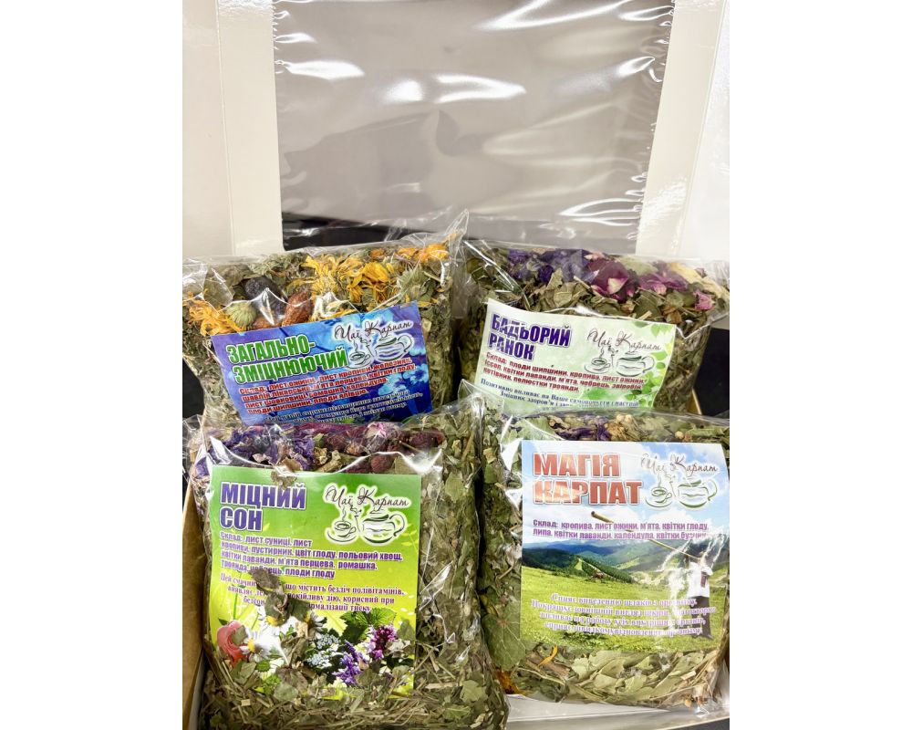 Чаї в наборі: Загально-зміцнювальний, Міцний сон, Бадьорий ранок, Магія Карпат.