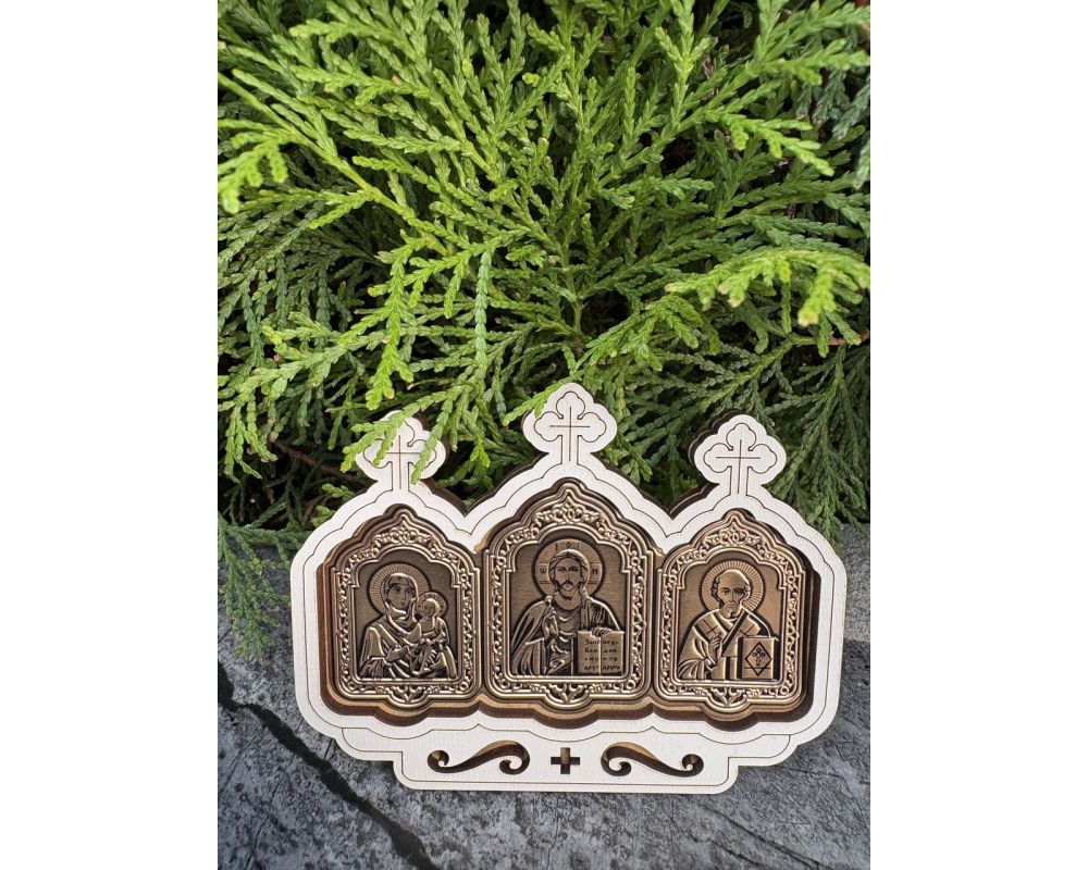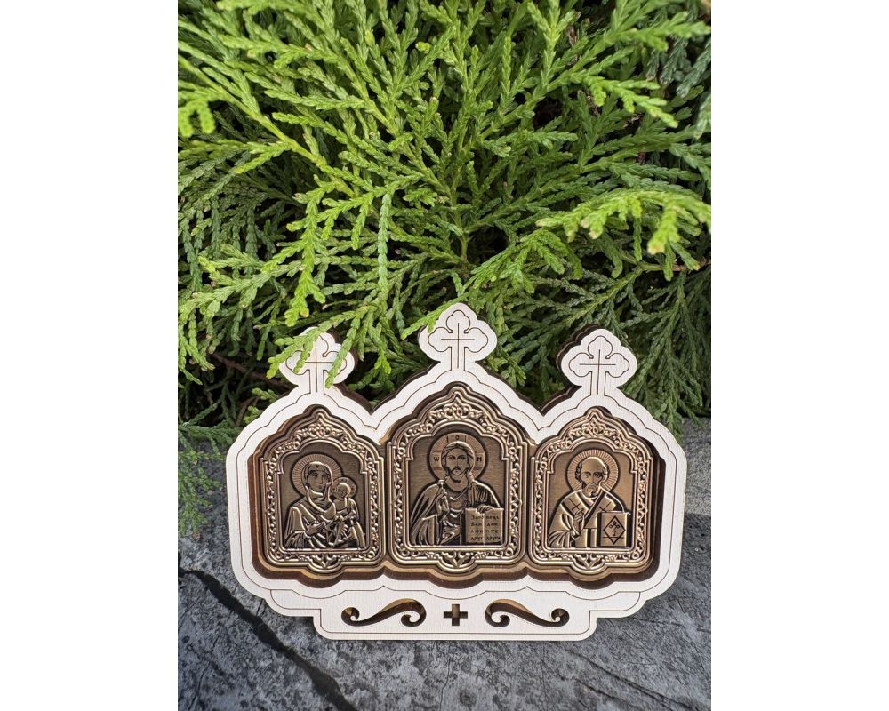 Автомобільний оберіг з іконами – це особливий духовний захист для водія та пасажирів у дорозі. Оберіг виготовлений з натурального дерева та прикрашений трьома іконами: Ісуса Христа, Пресвятої Богородиці та Святого Миколая – покровителя мандрівників і водіїв. Такий оберіг традиційно розміщують в автомобілі, щоб він оберігав від небезпеки, приносив спокій, удачу та благословення в дорозі.