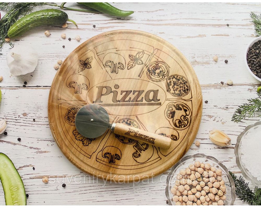 Набір для піци, виготовлений з натурального дерева. В набір входить дошка для піци Ø 27 см і ніж для піци.