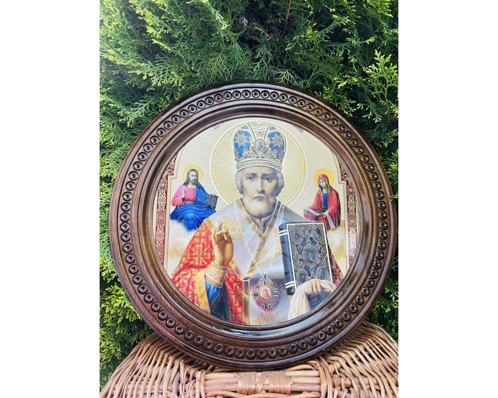 Дерев'яна тарілка із зображенням Святителя Миколи Чудотворця святителя Микола Чудотворець, він же Микола Угодник - найбільш шанований святий після Божої Матері. Молитва перед іконою Святого Миколая допомагає у всьому і у всіх життєвих випадках, святий архієпископ Мир Лікійських своєї заступницької молитвою допомагає в лікуванні від тяжких душевних і тілесних захворювань, в освіті розуму у дітей, в поєднанні люблячих в законному шлюбі, в бажанні батьків благополучного заміжжя дочок , в припиненні будь-яких міжусобиць сімейних, сусідських, військових. Ікона Святого Миколая допомагає абсолютно у всіх життєвих проблемах від великих до дрібниць, у виконанні багатьох бажань. Недарма в багатьох слов'янських країнах, навіть католицьких, наприклад, в Польщі, образ святого Миколая здавна злитий з образом нашого Діда Мороза. Поляки звуть його Швенто Миколай, і звернення до нього допомагає отримати бажаний різдвяний подарунок