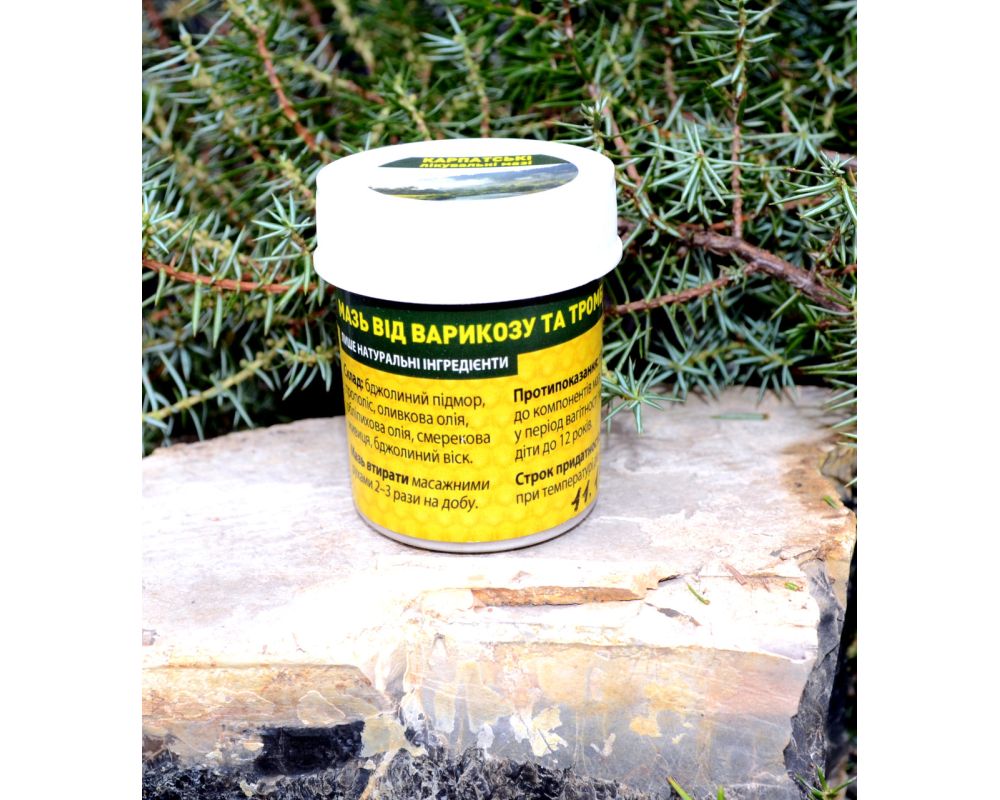 Склад: бджолиний підмор, прополіс, ялинова живиця, оливкова олія, масло обліпихи, бджолиний віск. Показання до застосування: варикозне розширення вен, тромбофлебіт. Спосіб застосування: мазь наносити круговими рухами на проблемну область протягом 3-5 хвилин до повного вбирання 2-3 рази на день.