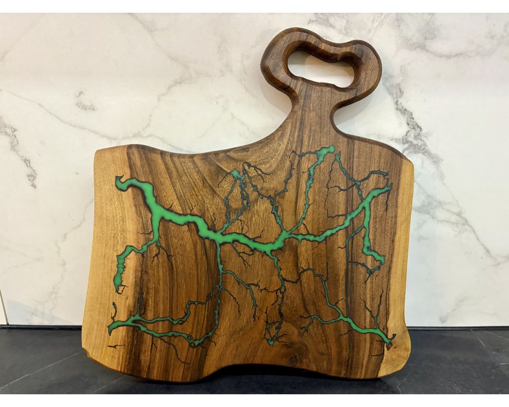 Стильна та функціональна дерев’яна дошка для нарізання та подачі страв, виготовлена вручну з натурального дерева з унікальним малюнком, залитим епоксидною смолою яскравого зеленого кольору. Кожна дошка має неповторний дизайн у техніці Lichtenberg – візерунки, що нагадують розгалуження річок або блискавку, роблять її справжнім витвором мистецтва.