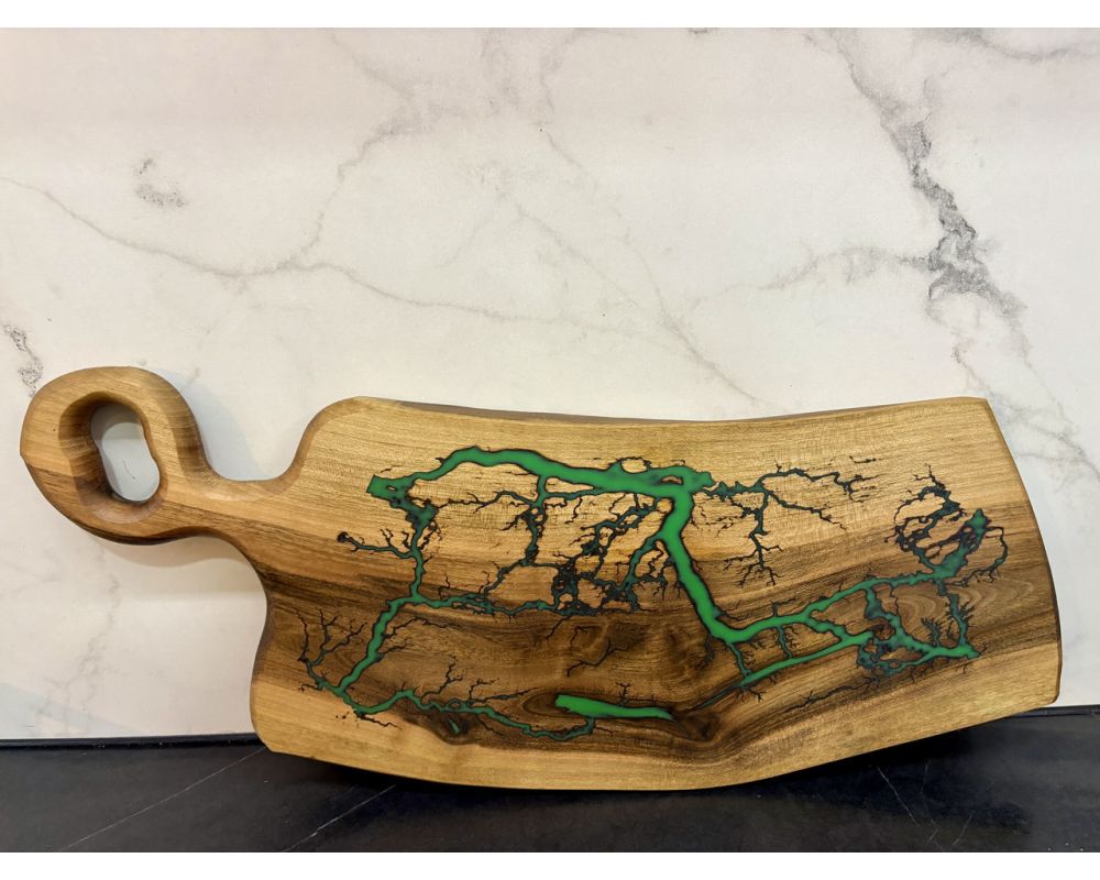 Стильна та функціональна дерев’яна дошка для нарізання та подачі страв, виготовлена вручну з натурального дерева з унікальним малюнком, залитим епоксидною смолою яскравого зеленого кольору. Кожна дошка має неповторний дизайн у техніці Lichtenberg – візерунки, що нагадують розгалуження річок або блискавку, роблять її справжнім витвором мистецтва.