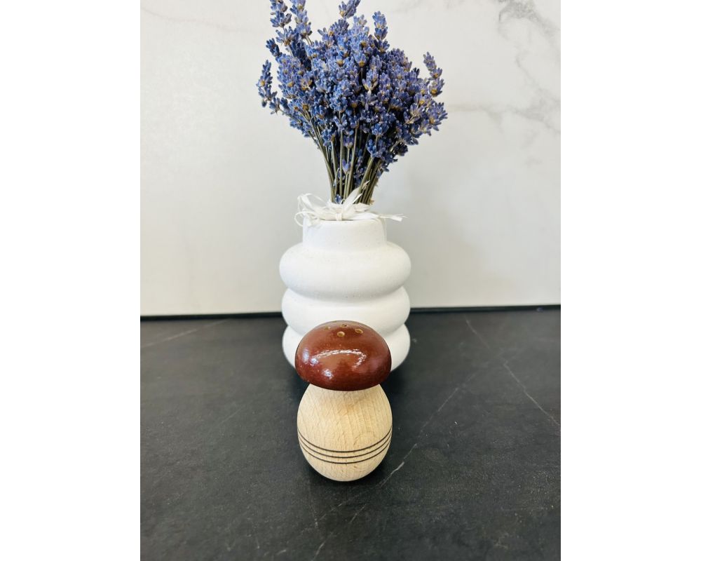 Сільничка, виготовлена із натурального дерева у формі грибочка. Красивий, оригінальний аксесуар на кухні.