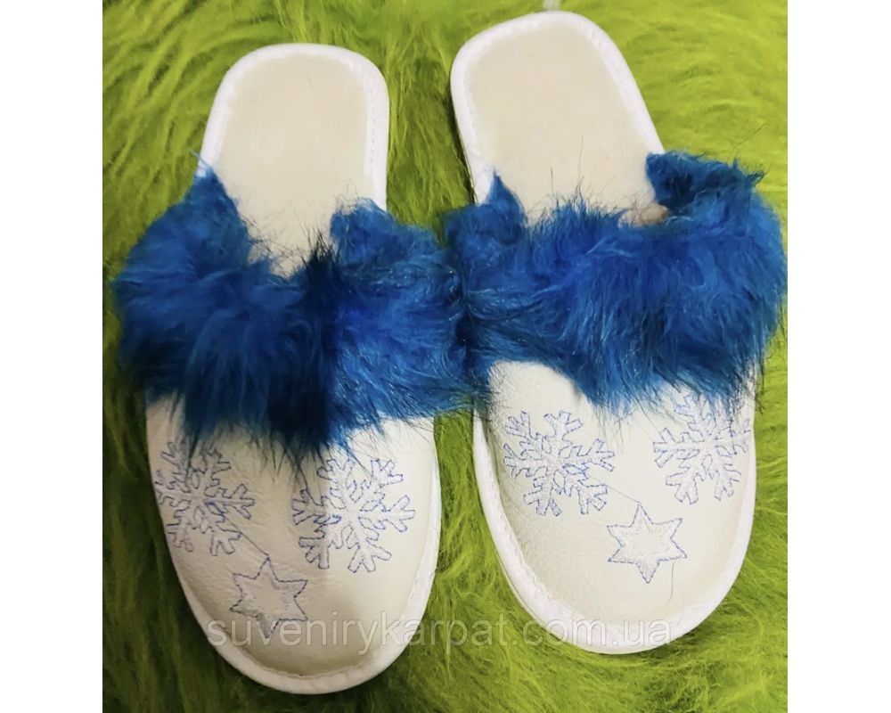 Домашні жіночі шкіряні капці з овечої шерсті, Сніжинка синє хутро