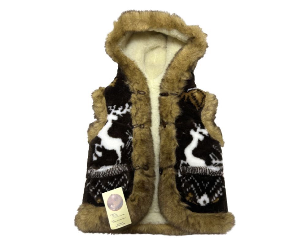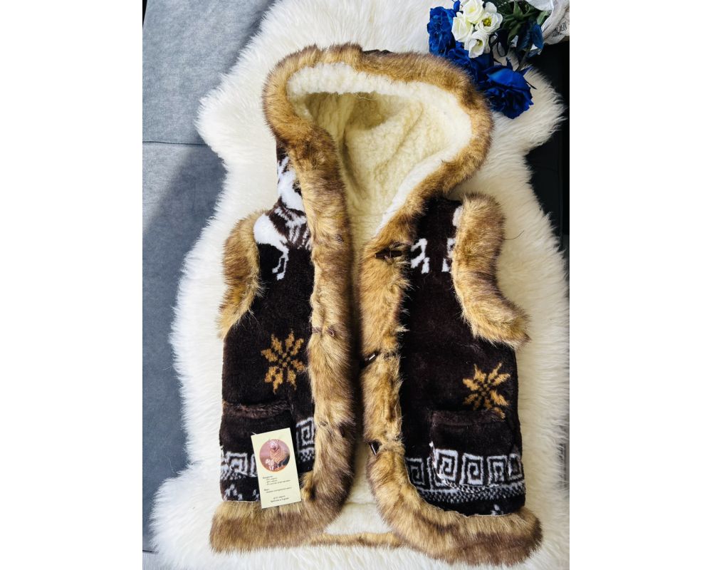 Жилет з овечої шерсті дитячий, орнамент олені коричневий з капюшоном 2